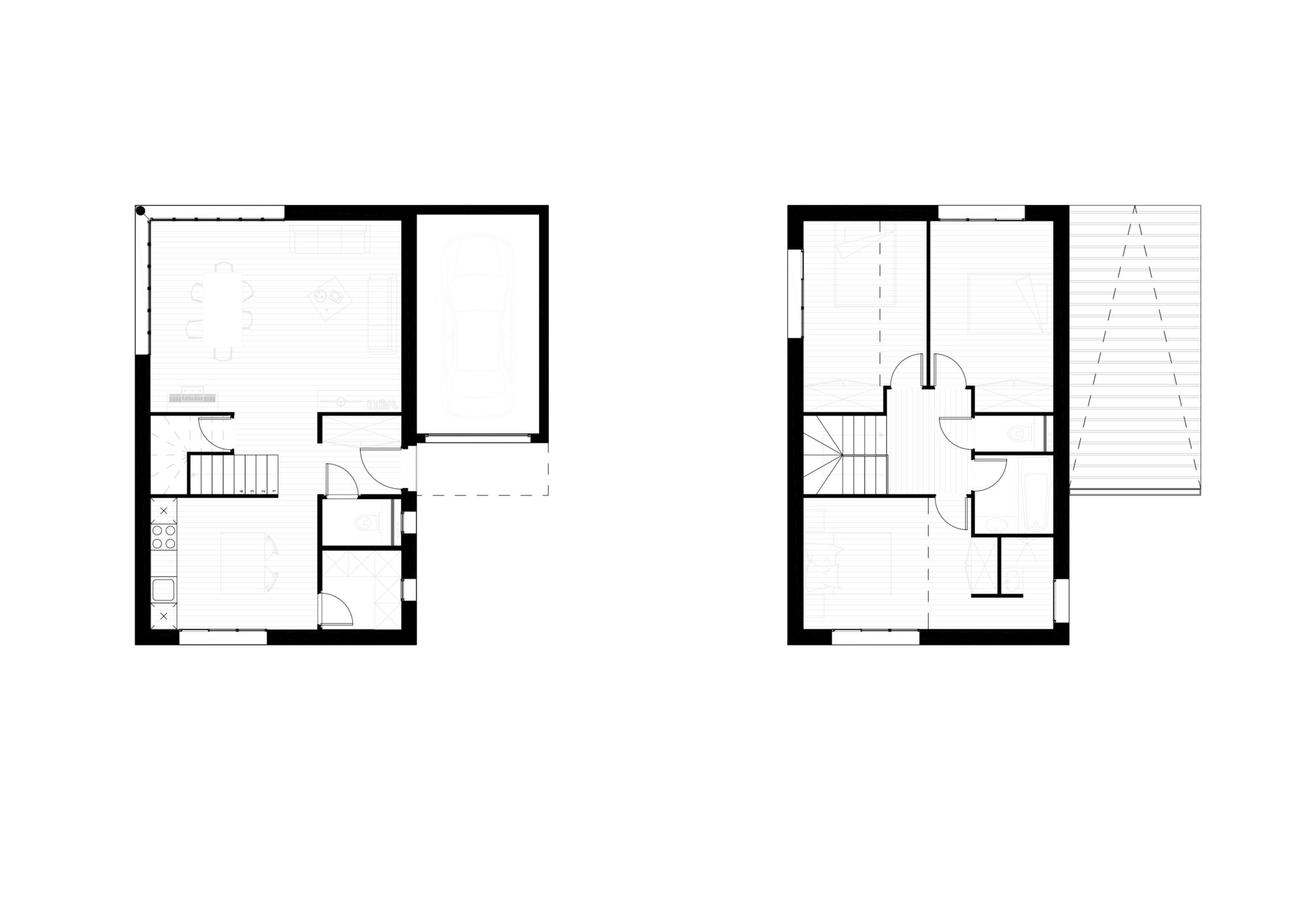 Le noyau de circulation verticale est implanté de manière centrale dans la maison. Au rez-de-chaussée, les pièces à vivre sont largement ouvertes sur le jardin grâce à de grandes baies vitées coulissantes. A l’étage, chaque pièce profite d’une lumière et d’une perspective particulière. L’ambiance et l’atmosphère y sont donc personnalisées. Une première chambre est implantée côté rue où une large baie est ouverte plein Est. Les deux autres chambres sont quant à elles localisées côté jardin : la première est ouverte en pignon Ouest et la seconde est ouverte en façade latérale Sud.